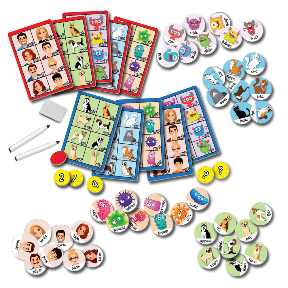 ΠΕΡΙΕΧΟΜΕΝΑ • 10 κάρτες χαρακτήρων (2 κάρτες σκύλων, 2 κάρτες γάτων, 2 κάρτες ανθρώπων, 2 κάρτες τεράτων, 2 κάρτες βακτηρίων) • 40 μάρκες χαρακτήρων • 5 μάρκες ερωτήσεων • 1 κόκκινη / πράσινη μάρκα • 2 μαρκαδόροι γράψε-σβήσε και σφουγγάρι • οδηγίες