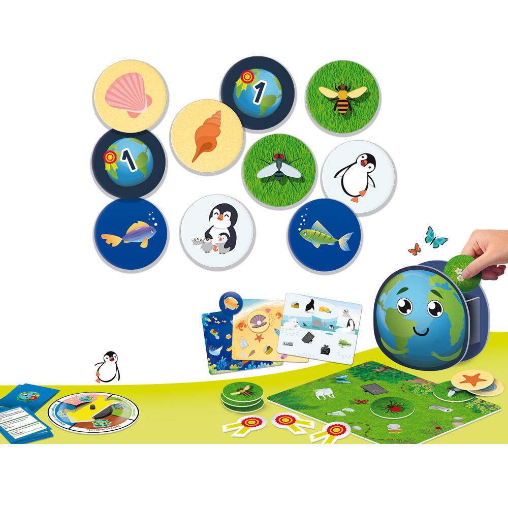 Περιεχόμενα: • Τρισδιάστατος πλανήτης • 24 μάρκες «Σώσε το περιβάλλον» • Τροχός με βελάκι • 56 κάρτες • 4 φάκελοι περιβάλλοντος • 50 βραβεία • Οδηγίες