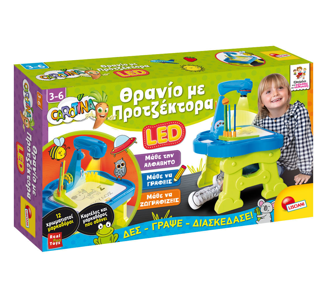 Ένα θρανίο με τον μαγικό προτζέκτορα LED, για πολλές εκπαιδευτικές και δημιουργικές δραστηριότητες. Με πλήρες πρόγραμμα γραφής, για να μάθετε πώς να γράφετε πολλές μικρές λέξεις. Επιπλέον, πολλά σχέδια για να χρωματίστε και να συλλέξετε!